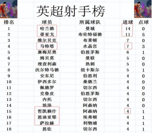 射手榜方面,哈兰德14球领跑,蒂亚戈11球紧随其后,马特塔今天点射建功,追上维尔贝克,两人7球并列第3,塞梅尼奥6球排第5。哲凯赖什复出没有进球,还是和埃泽,萨拉赫,恩佐等人4球刚好挤入前十。