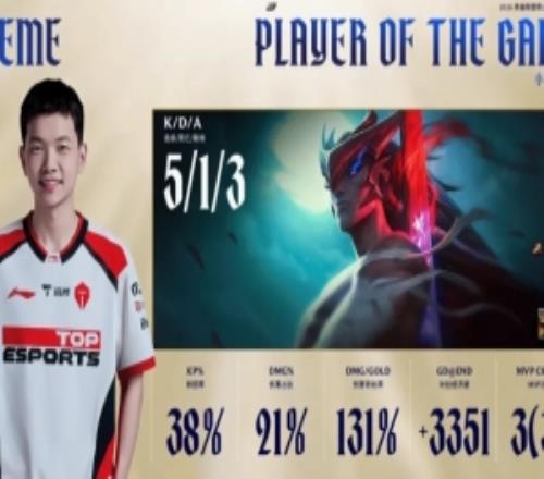 Creme永恩打出513战绩,斩获TES对阵WE第一局MVP 大精灵 2026-02-28 20:46:34 体育资讯2月28日称 在刚刚结束的TES对阵WE的BO5比赛中,Creme永恩打出5/1/3战绩,斩获TES对阵WE第一局MV。 战绩 上一篇: Faker粉丝频道留言:谢谢大家的支持,下赛季我会做更好的准备 下一篇: 晴天:TES第二赛段至少得换3个人wayward:换69还有小奶和教练