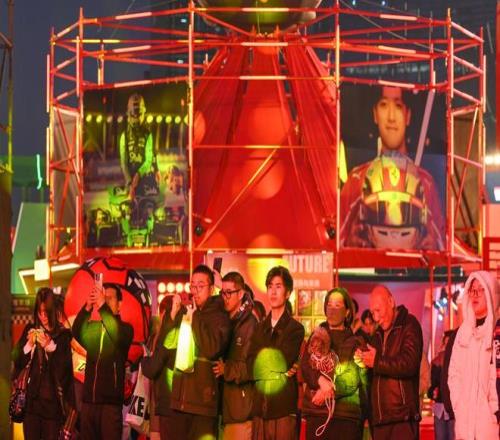 2026年3月11日,上海西岸,格子旗嘉年华的夜间演出吸引了游客的关注,嘉年华期间推出的“寻找周冠宇”主题展以中国车手周冠宇的成长历程为主线,通过“梦想的摇篮”“通往F1的阶梯”“历史与荣光”“蓄势与未来”四大篇章,系统呈现中国首位F1车手从爱好卡丁车的上海少年到征战世界顶级赛事的非凡轨迹。澎湃新闻记者 吴栋 图